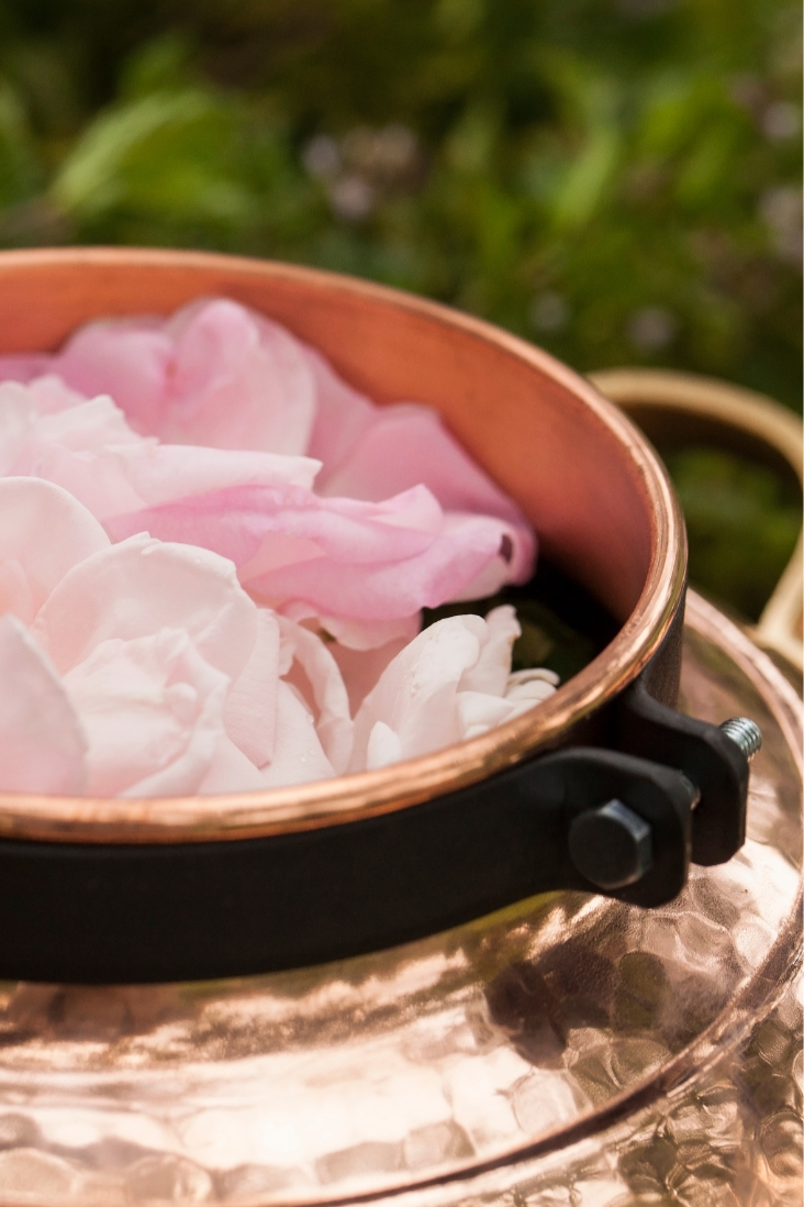 To produce 100 ml of rose essential oil, approximately 500 kg of fresh rose petals are required. This process also yields around 350 litres of rose hydrosol.